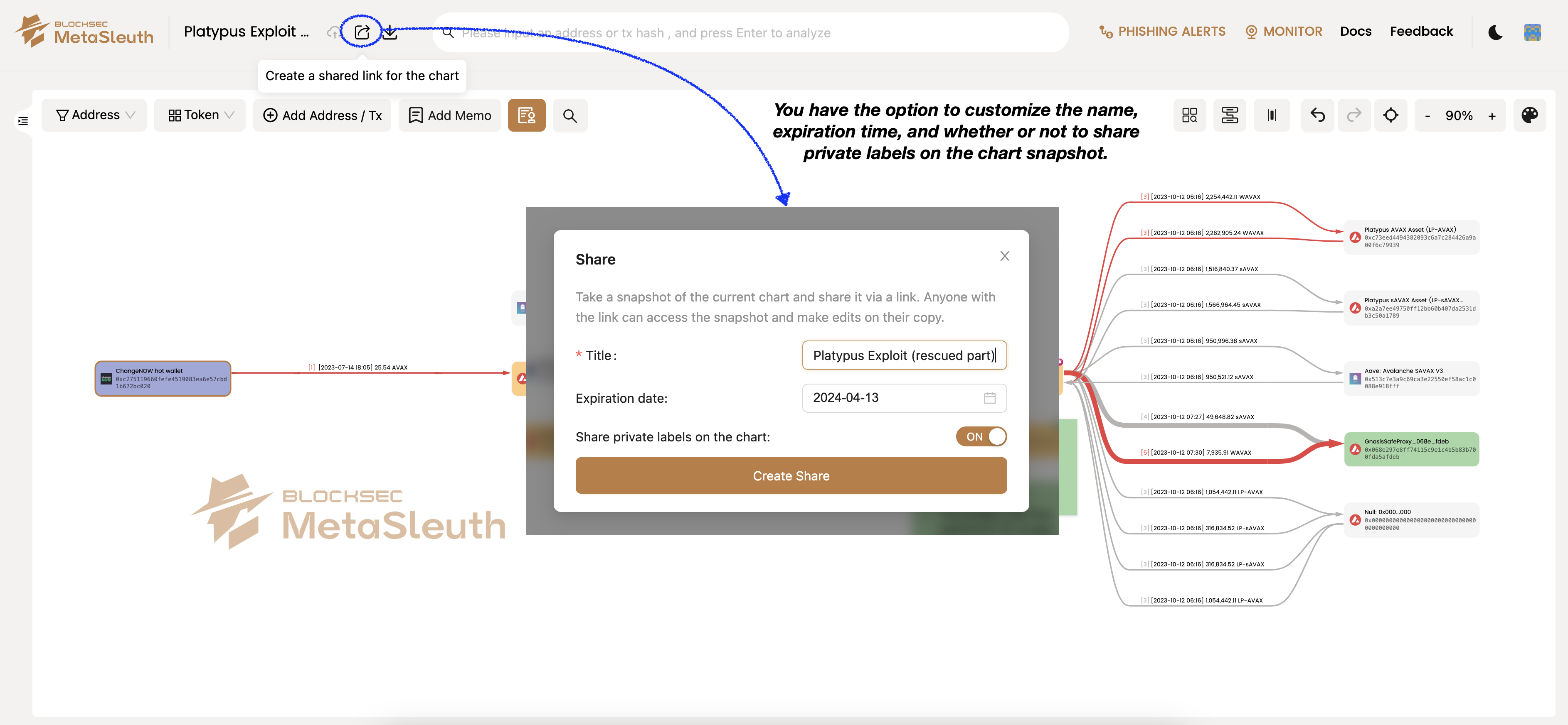 MetaSleuth erleichtert dies durch die Funktion 'Diagramm teilen', mit der Sie Ihre Analysen ganz einfach mit anderen teilen können, um den aktuellen Inhalt der Leinwand zu erkunden, in Details einzutauchen und ihn sogar weiter zu bearbeiten.