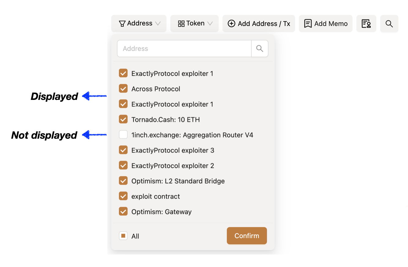 **`Filtre d'Adresse`** liste toutes les adresses analysées, y compris celles affichées sur le canevas et celles non affichées sur le canevas. Les utilisateurs peuvent rechercher des adresses spécifiques dans le filtre et ajuster leur statut de visualisation.