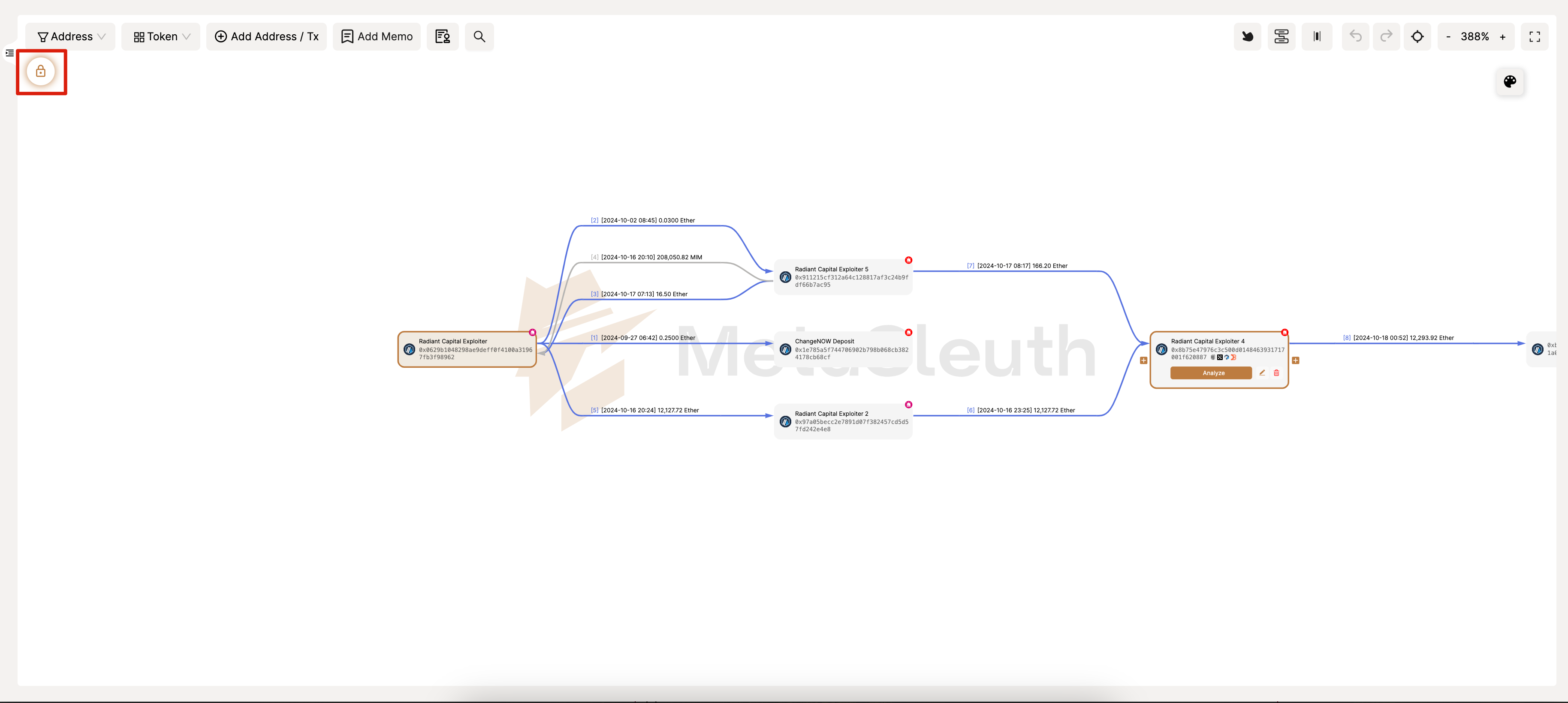 En cliquant sur un nœud d'adresse, vous afficherez des détails tels que le label de l'adresse, les balises associées, le score de risque, le solde d'actifs et les interactions en chaîne. Il est important de noter que les transferts d'actifs affichés sont uniquement ceux sélectionnés par le partageur pour être affichés sur le canevas. Pour voir un ensemble plus complet de transferts d'actifs, vous devrez déverrouiller le canevas pour une nouvelle analyse.