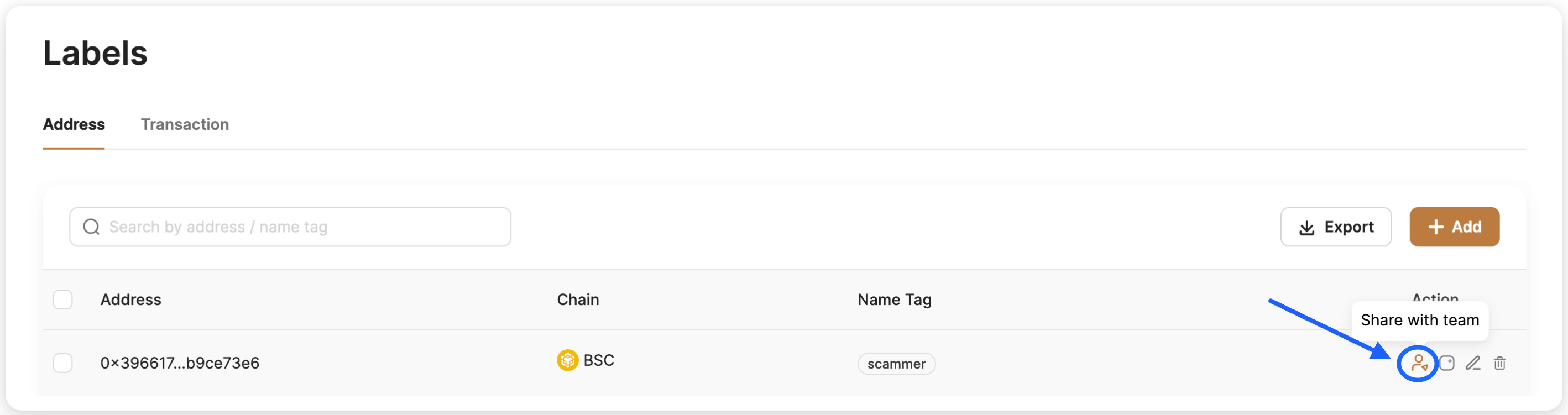 Après avoir rejoint une équipe, les utilisateurs peuvent partager des données de leurs comptes personnels avec l'équipe. Les utilisateurs peuvent partager leurs étiquettes d'adresse, graphiques sauvegardés, liens partagés et moniteurs avec l'équipe pour la collaboration.