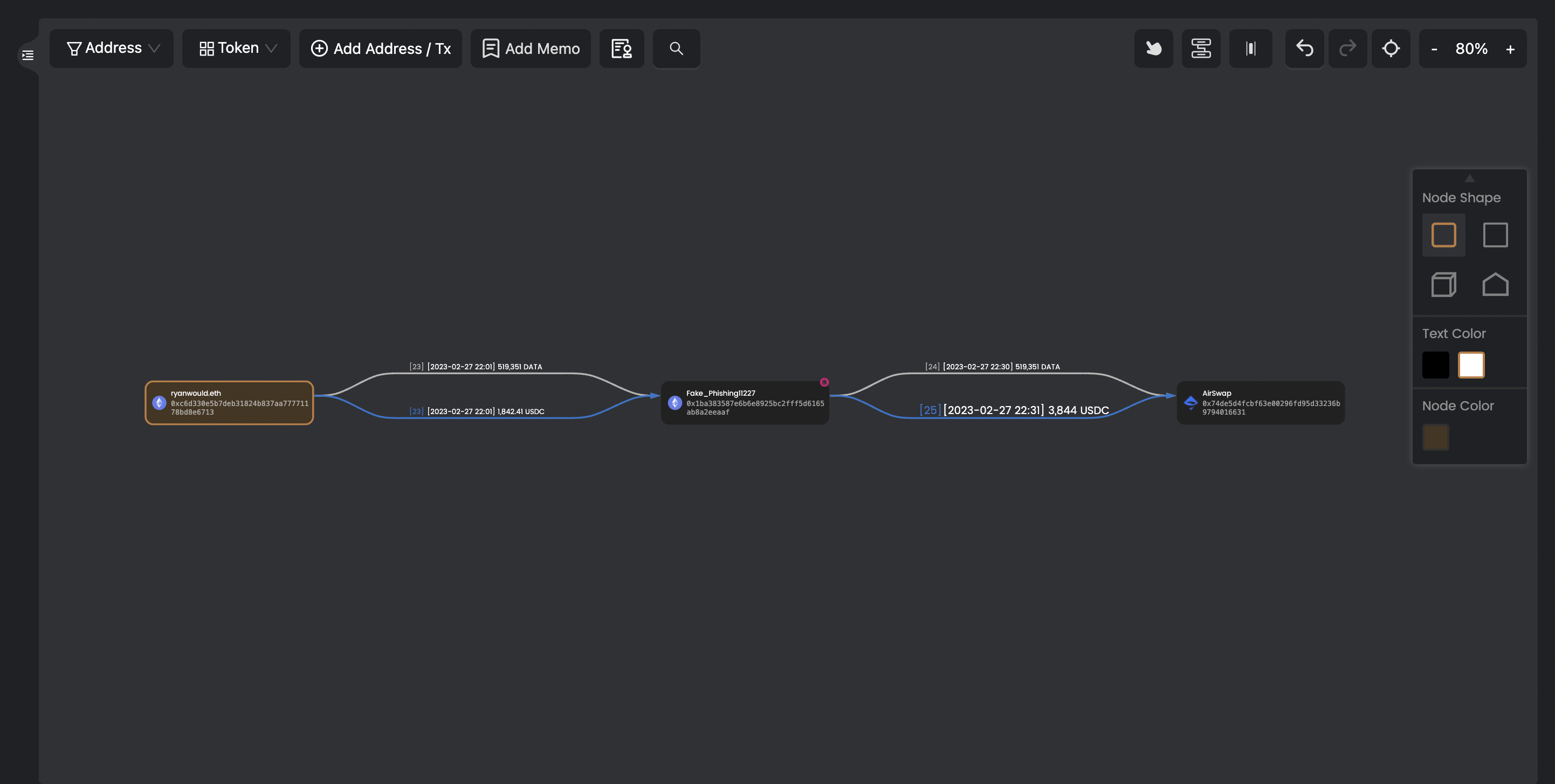 Le flux de fonds devient extrêmement concis et clair. Pour tracer la sortie des fonds, nous avons étendu encore le deuxième saut du transfert de fonds. Dans le deuxième saut de la relation de transfert de fonds, nous avons constaté que l'adresse de phishing "Fake_Phishing11227" avait transféré les fonds volés vers Airswap et échangé des tokens via Airswap.