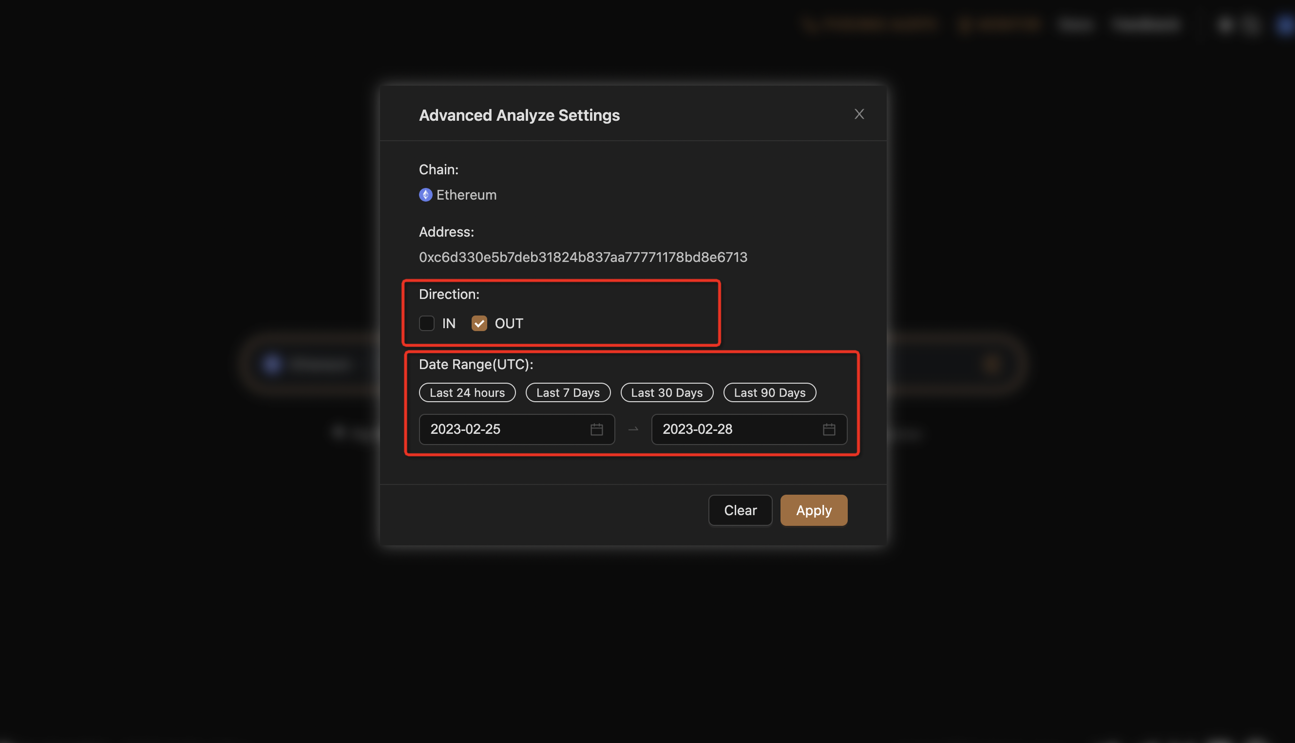 Après être entré dans le panneau des paramètres d'analyse avancée, nous pouvons choisir la direction des fonds et la plage de temps. Dans cette tâche, nous nous concentrons uniquement sur la sortie des fonds (out) et la période pendant laquelle la pêche a eu lieu (2023-02-25->2023-02-28). Après avoir complété les paramètres de configuration, nous cliquons sur appliquer et appuyons sur Entrée pour entrer sur le canevas.