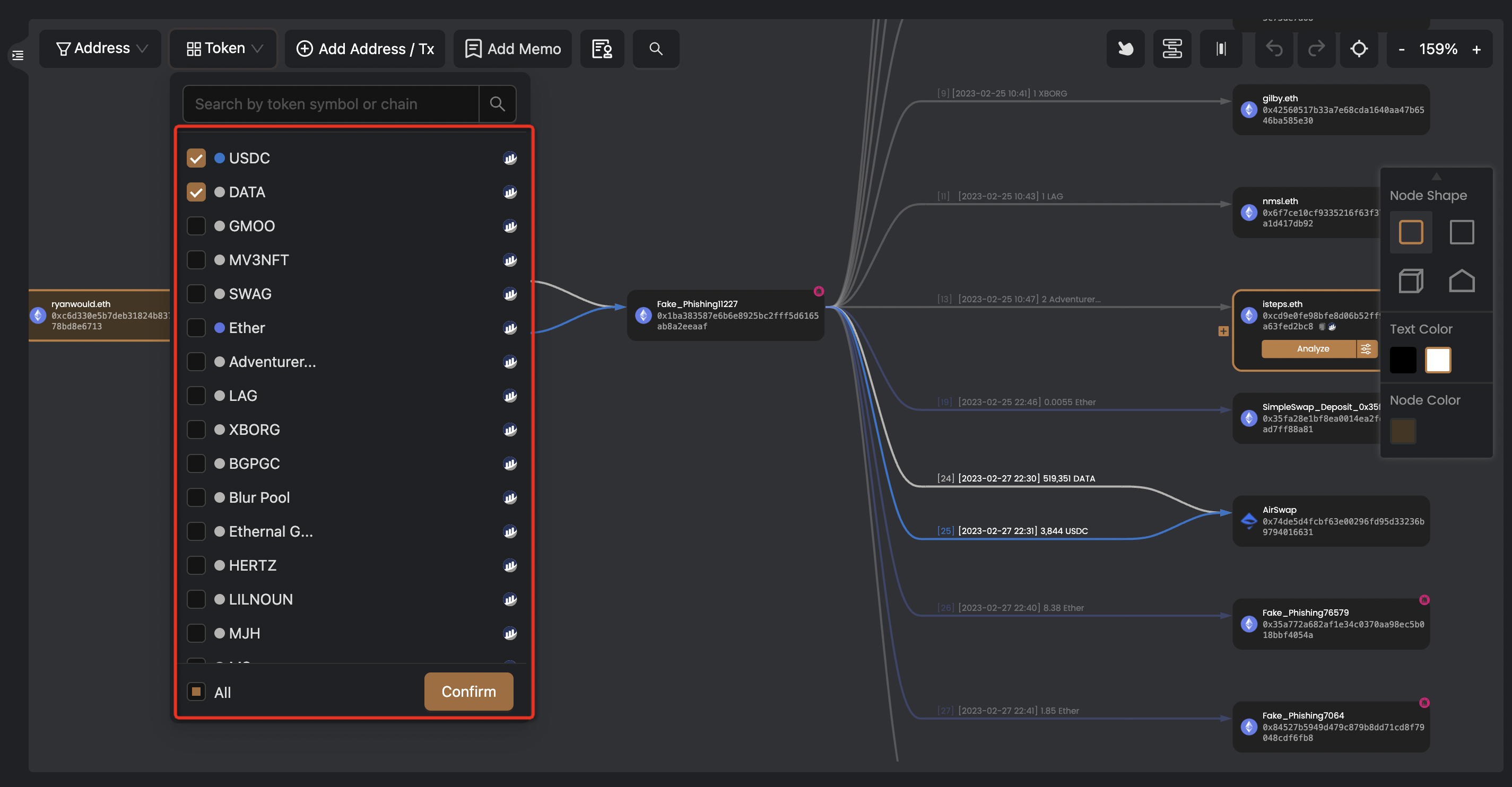 De plus, en utilisant l'étiquette d'adresse maintenue par MetaSleuth, nous pouvons identifier rapidement que dans ce bref laps de temps, seuls deux flux de fonds inhabituels ont été détectés, tous deux dirigés vers l'adresse "Fake_Phishing11227". Ces transactions anormales impliquaient 1 842 USDC et 519 351 tokens DATA, comme représenté dans le graphique.