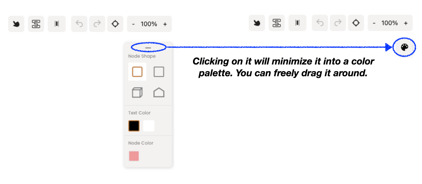 Панель инструментов редактирования внешнего вида предоставляет возможность редактировать внешний вид узлов, ребер и заметок. Когда вы открываете холст, по умолчанию сначала будет отображен редактор формы узла. Вы можете свернуть его в диаграмму холста и свободно перетаскивать, давая себе больше пространства для анализа.
