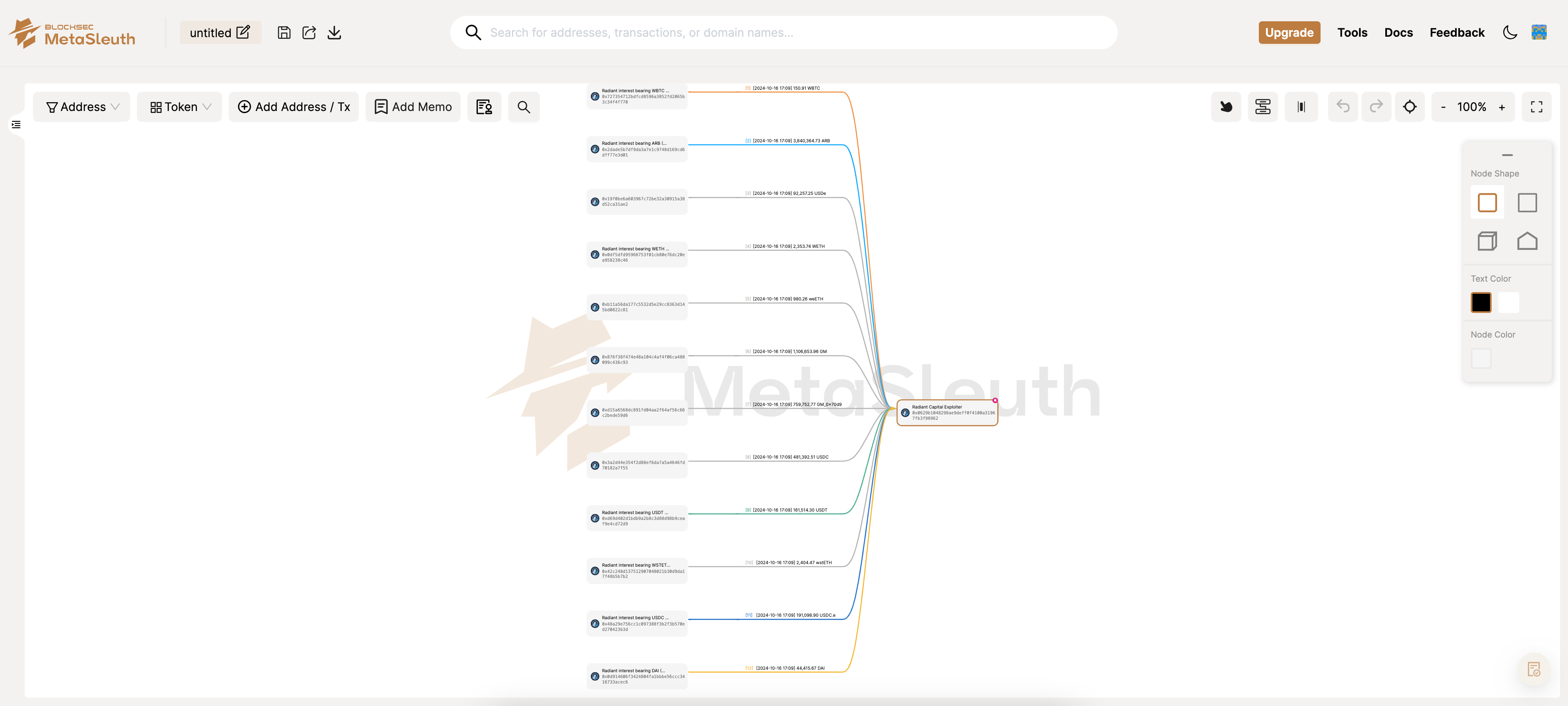 Например, если вы ищете `0x0629b1048298ae9deff0f4100a31967fb3f98962` и выбираете Arbitrum, вы можете просмотреть поток средств Radiant Capital Exploiter в этой цепочке. Обратите внимание, что не все переводы средств будут отображаться на холсте для удобочитаемости. Чтобы узнать, какую информацию можно получить через функцию Analyze, посетите [Trace Funds - Analyze.](https://docs.metasleuth.io/ru/rukovodstvo-polzovatelya/trace-funds-ways-to-retrieve-transfer-data/analyze)