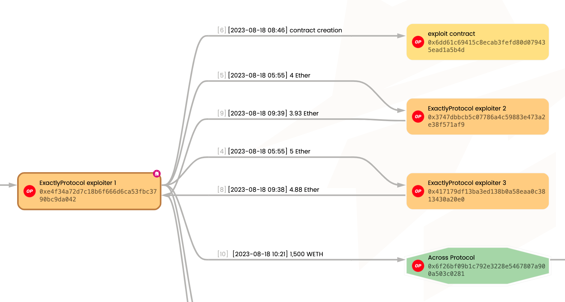 В приведенном ниже примере ребро от узла **Euler Finance Exploiter 2 (0xb66cd)** к **KyberSwap Exploiter (0x50275e)** указывает, что **Euler Finance Exploiter 2** отправил **0.110 Ether** **KyberSwap Exploiter**.