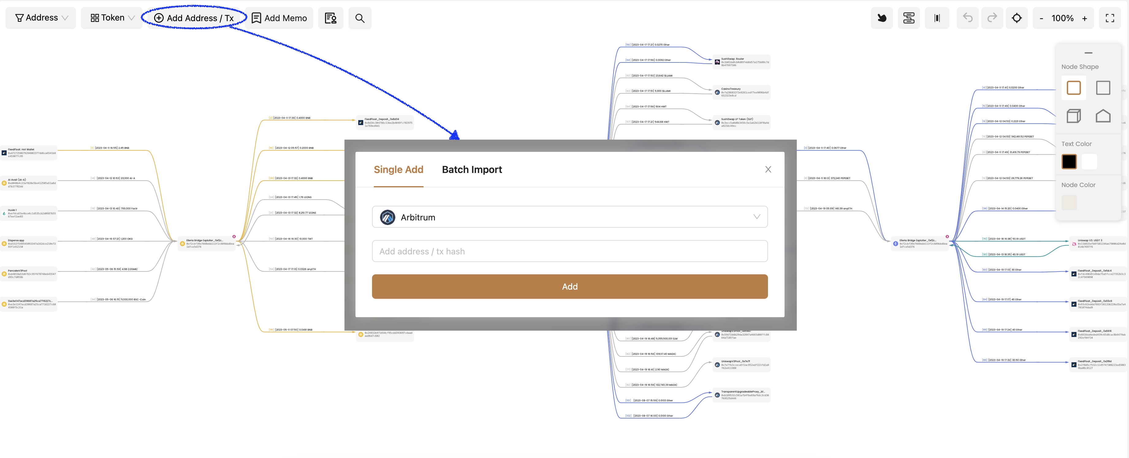 Когда вы добавляете адреса, они будут размещены на холсте без немедленного анализа, что позволяет вам провести анализ, расширение или загрузку дополнительных операций позже. С другой стороны, когда вы добавляете транзакции, MetaSleuth извлечет внутренние переводы активов этих транзакций и отобразит их все на холсте.