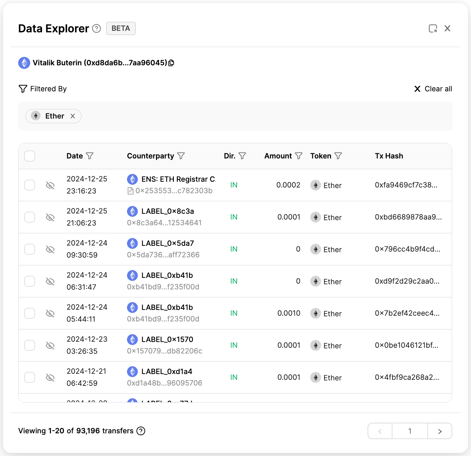 Если вы не можете найти все необходимые данные для конкретного адреса, используя другие функции, вы можете воспользоваться Data Explorer. Эта функция позволяет получить более полные данные. В Data Explorer данные о переводах отображаются в обратном хронологическом порядке, и вы можете перемещаться по страницам, чтобы увидеть больше. Вы также можете использовать фильтры для получения более специфичных результатов в больших наборах данных.