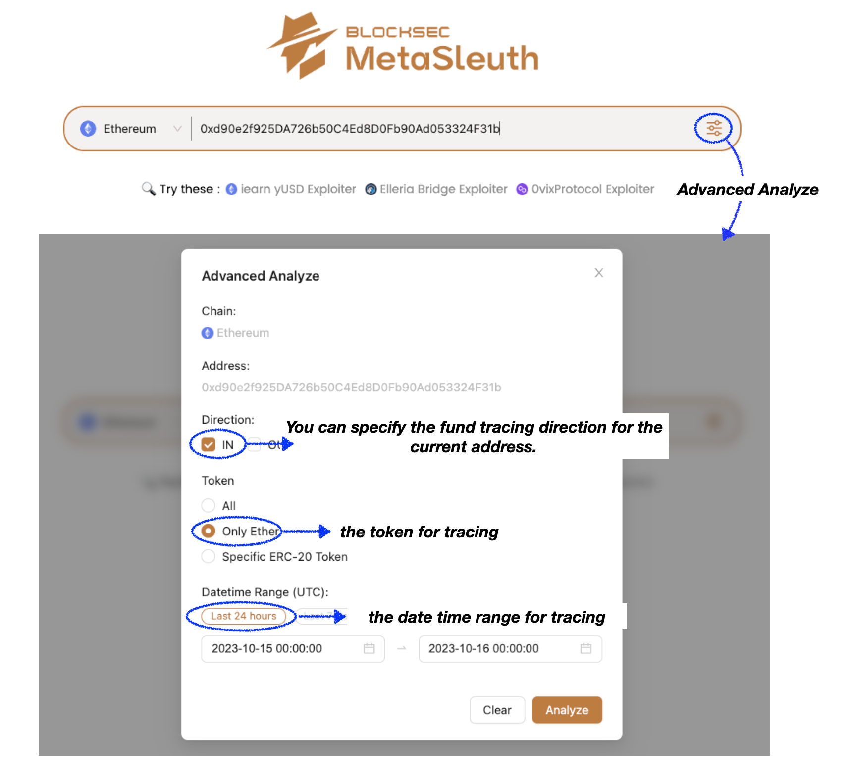 As the name suggests, Advanced Analyze is an enhanced version of the Analyze feature. With Advanced Analyze, you have the ability to specify the exact direction, token, and date range for your analysis. By utilizing this feature, you can retrieve the desired interaction data exactly as you expect it to be.
