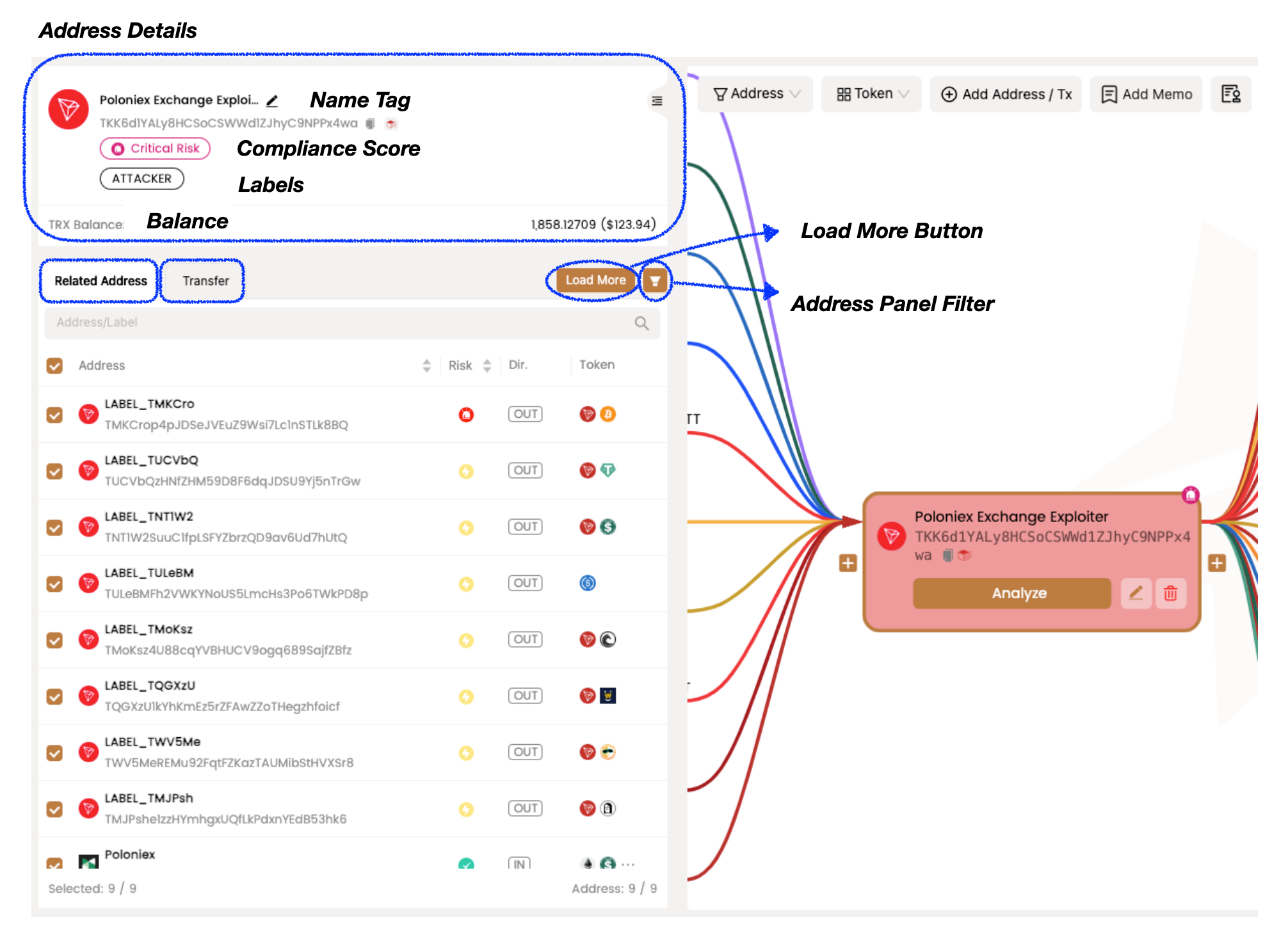 **`相关地址`**: 这些是与目标地址有交互的地址，根据获取的交易数据编制的。除了地址本身，您还可以查看每个地址的风险评分、资金流向以及流动中所涉及的资产类型。