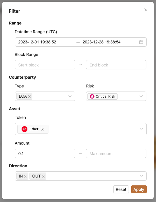 **`地址面板过滤`**: 当一个地址有大量交互时，可能需要一个过滤工具来缩小调查范围。