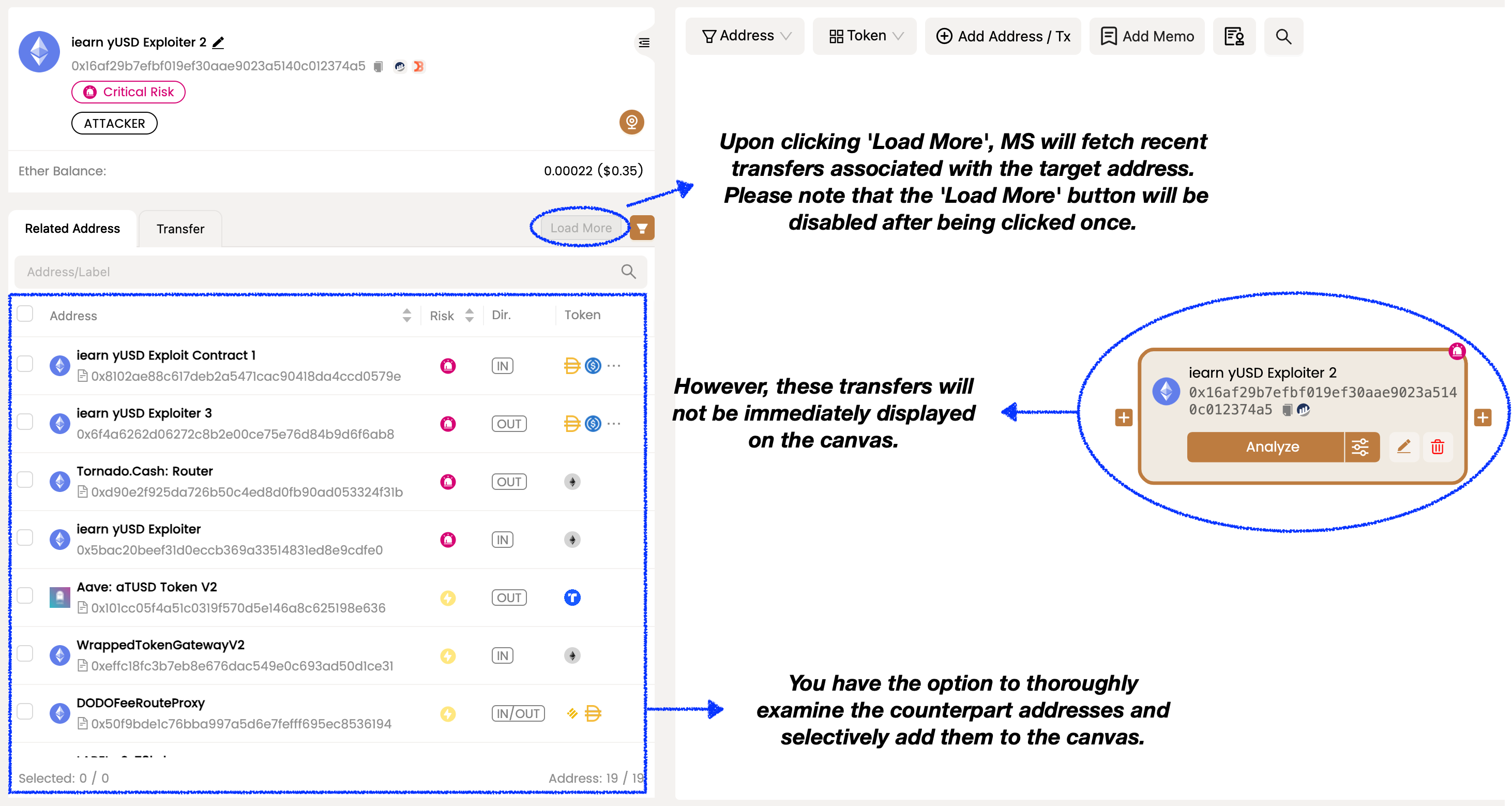 加載更多功能使您能完全掌控要在畫布上顯示的數據。它為目標地址檢索資產轉移信息，但不會自動呈現它們。您可以通過檢查地址面板中的名稱標籤、風險信息、交互方向和其他細節，小心選擇您想顯示的資產轉移信息。