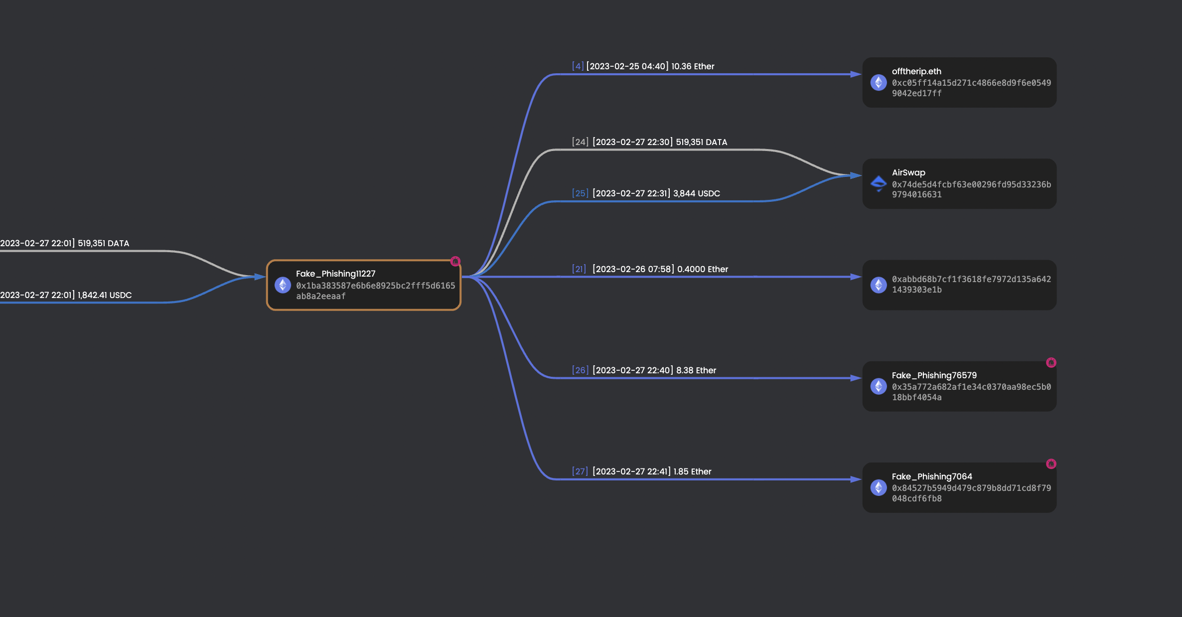 資金流動變得非常簡潔明了。為了追蹤資金流出，我們進一步擴展了資金轉移的第二跳。在資金轉移關係的第二跳中，我們發現網絡釣魚地址 "Fake\_Phishing11227" 將被盜資金轉移到了 Airswap，並通過 Airswap 交換代幣。