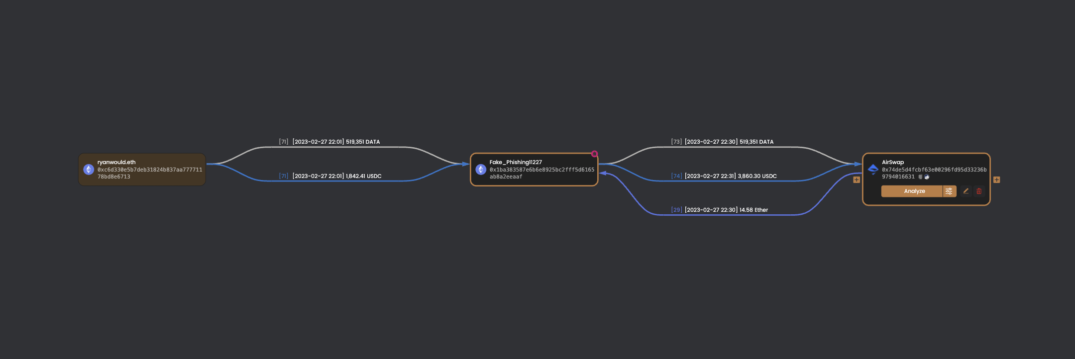 * \_ryanwould.eth (0xc6D330E5B7Deb31824B837Aa77771178bD8e6713) 在網絡釣魚中遭受了巨大損失。一位憤怒的鏈上偵探受委託找出被盜資金的去向，並揭露隱藏的網絡釣魚團伙。