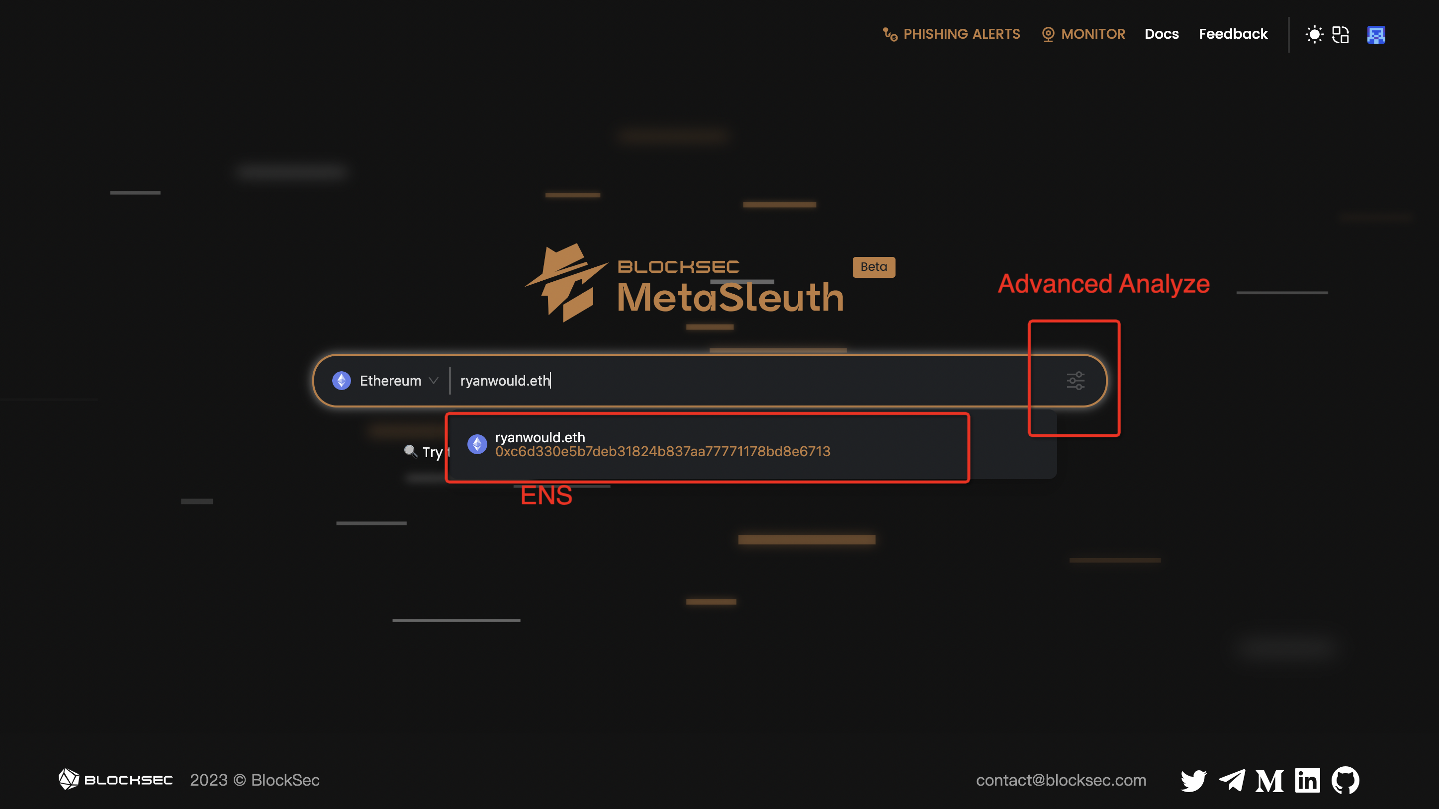 Metasleuth 將根據 ENS 名稱解析相應的地址。然後，在搜索框的右側，使用 Metasleuth 的核心功能，`高級分析`。